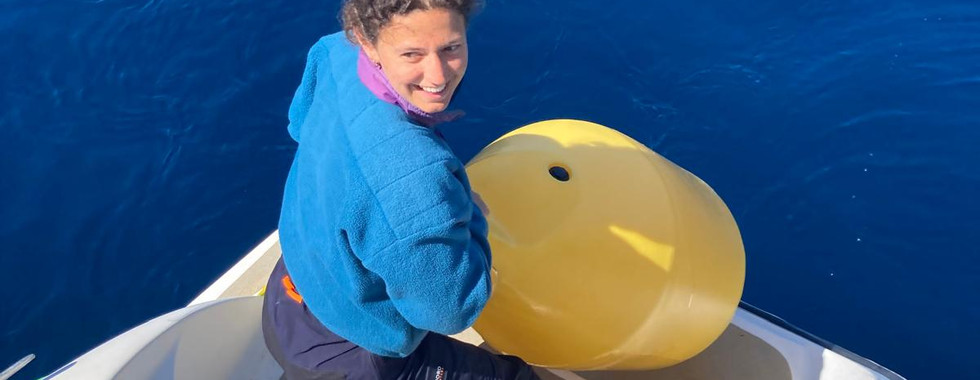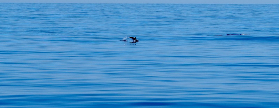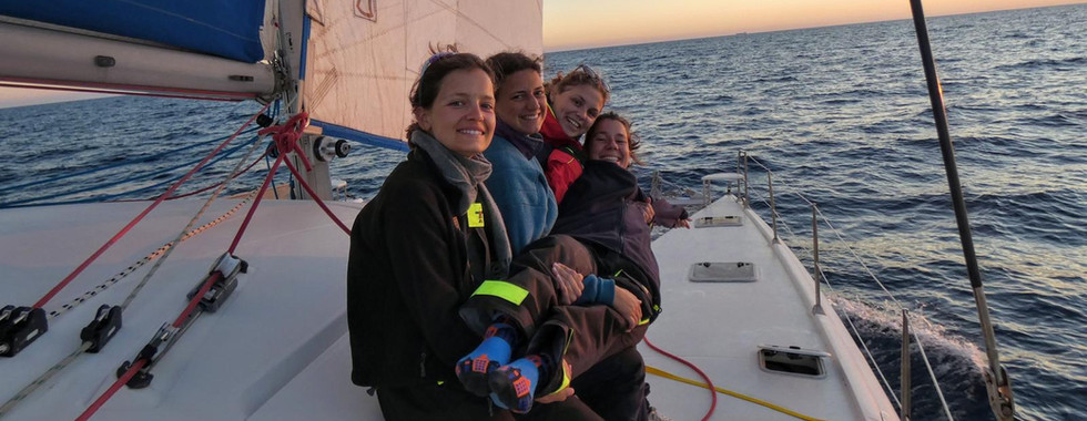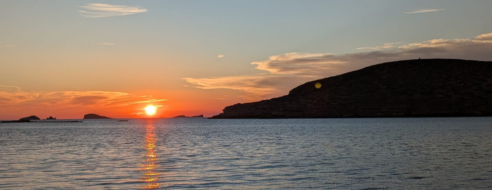 Mercredi, aux premières lueurs du jour, nous quittons le port de Badalona pour notre première grande traversée : direction Ibiza, et près de 30 heures de navigation devant nous. Le départ est serein, le moral au beau fixe. Au moment du déjeuner, Mathilde repère un drôle de nuage à la surface de l'eau... Après quelques secondes d'étonnement, nous nous rendons compte qu'il s'agissait bien d'un souffle de baleine ! Trop loin pour distinguer l'espèce, nous avons tout de même été émerveillées et très reconnaissantes d'avoir pu observer ce spectacle. Le soir venu, pour célébrer notre premier coucher de soleil en mer, quelques dauphins viennent nous saluer dans les reflets orangés des vagues.